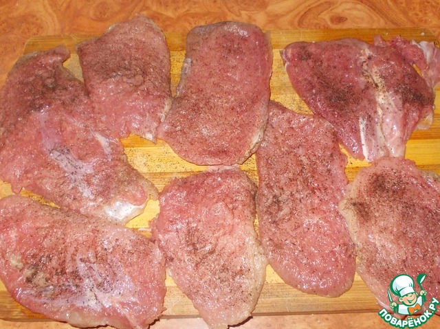 Отбиваем мясо с двух сторон чуть присаливаем и приперчиваем.