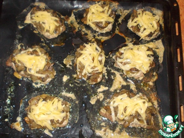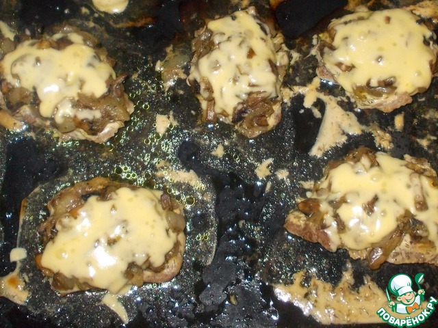 Выкладываем отбивные на противень. На каждый кусочек наливаем по ложке ряженки. Сверху накладываем по ложке грибов. Ставим на 15 минут в духовку при температуре 200 градусов. Пока мясо запекается натираем на терке сыр.