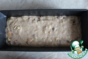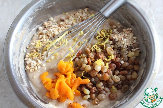 Заранее распарить изюм, курагу. Обсушить, добавить к тесту. Я добавила толченный фундук и цедру лимона. Перемешать.