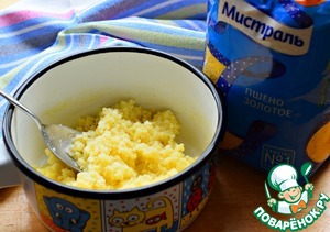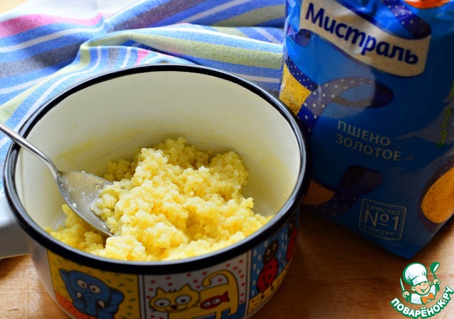 Залить готовое пшено кипяченой водой, добавить кукурузное (подсолнечное) масло, соль, сахар, перемешать.