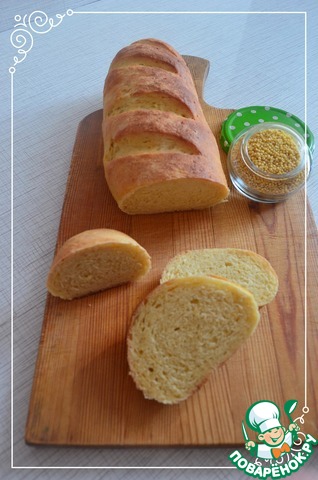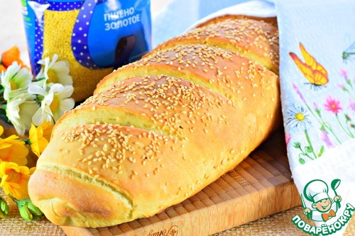 Румяная, золотистая, хрустящая тоненькая корочка. Нежный, воздушный, пружинистый мякиш. Это пшенный батон! Вкусный домашний хлеб, чуть сладковатый, очень похож на сдобный. Ароматный и такой душистый. С супом, с овощным салатом, с молоком или с чаем - хорош и так, и этак. Угощайтесь!