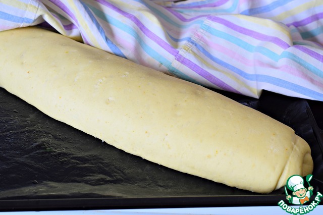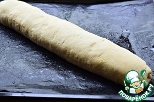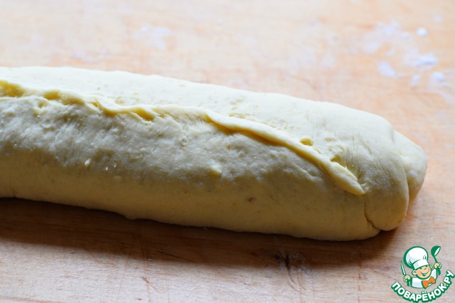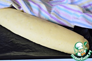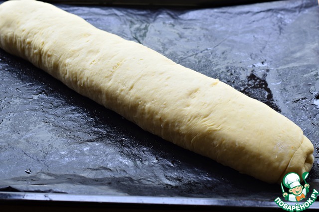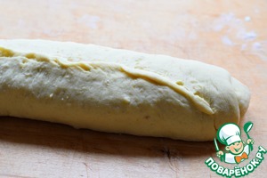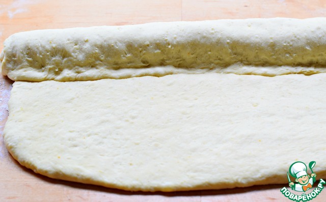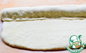 Выложить тесто на присыпанную мукой рабочую поверхность, обмять, раскатать в прямоугольник толщиной примерно 1,5 см.
