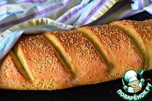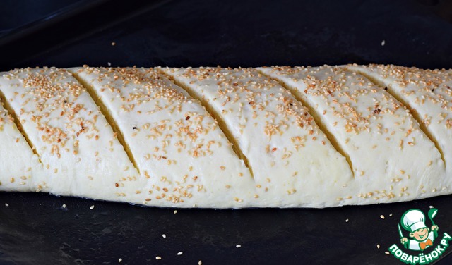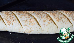 Сделать на батоне косые неглубокие надрезы острым ножом, сбрызнуть батон водой и посыпать кунжутом.