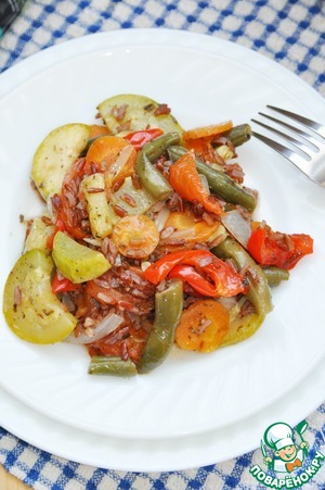 Очень вкусное и несложное блюдо. Добавила баклажан, а также вместо репчатого лука положила два небольших красных.