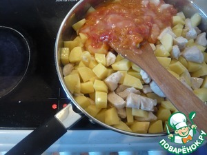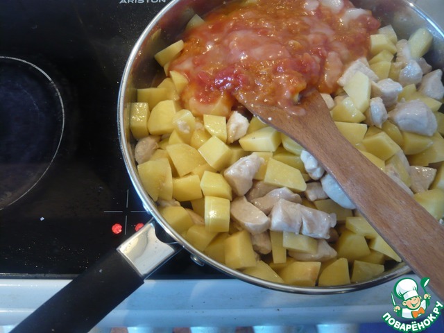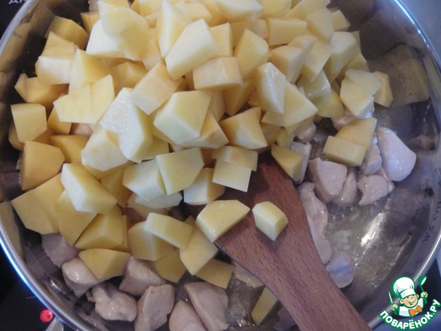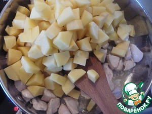 К филе добавляем картофель. Все хорошо перемешиваем. Вливаем воду 100 мл. И тушим на среднем огне.