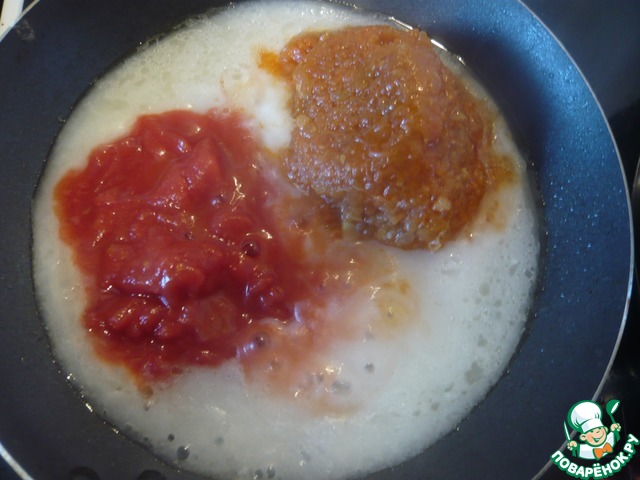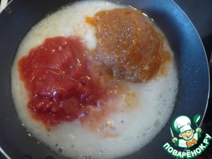 К муке добавляем томаты и икру. Все хорошо перемешиваем и доводим до кипения.