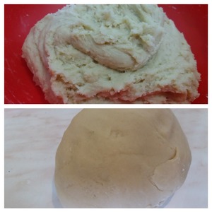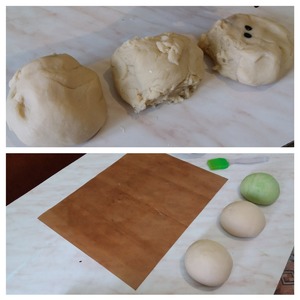 Одну часть теста весом 346 грамм покрасить в зелёный цвет пищевой краской (или в красный цвет пищевой краской, или вишнёвым сиропом) - хорошо вымесить, чтобы цвет лёг равномерно.