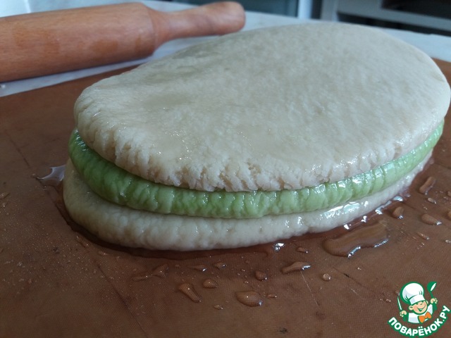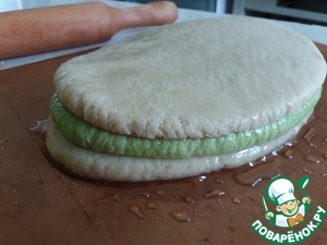 • На этот первый слой положить зелёную часть теста (раскатать отдельно, затем положить, так будет проще ориентироваться по размеру первого слоя) - слегка смочить сиропом.