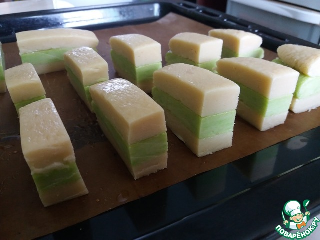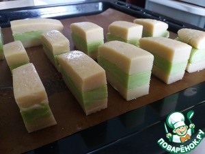 • Снять с холода, разрезать на длинные полосы шириной 5-6 см, а затем каждую полосу на небольшие кусочки 2-3 см.
