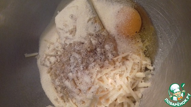 • Сначала отварить шампиньоны в подсоленной воде. Остудить. Смешать творог, натертый сыр, яйца, манку, соль и перец по-вкусу