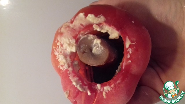 • В перец кладем чуть-чуть начинки, целый шампиньон и закрываем его полностью начинкой