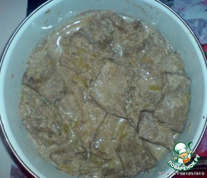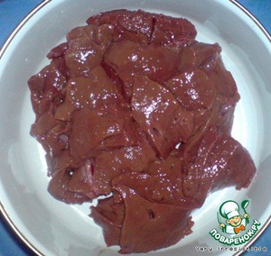 • Печень промыть, обсушить и очистить от пленок. Нарезать ломтиками и каждый еще на 2 части. Залить сливками.(Я не замачивала, сразу тушила, но мне показалось, что будет лучше ненадолго замочить). Заранее отварить гречку.