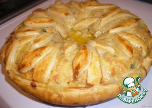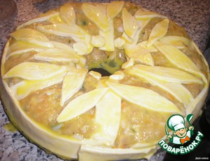 Украшаем кольцо полосками и листочками из слоеного теста.