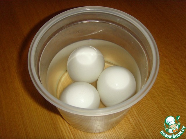 В 4-х частях воды растворяем 1 часть соли (по весу). Полностью заливаем эти рассолом яйца и оставляем, при комнатной температуре, на 30-40 дней. За это время яйца просаливаются и становятся почти твердыми. Для салата нам нужны только желтки. -