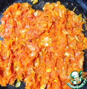 Морковь почистить, натереть на крупной тёрке, добавить к луку и обжарить 3-5 минут.