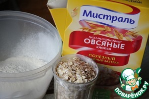 Просеять в миску муку с разрыхлителем, добавить овсяные хлопья.