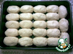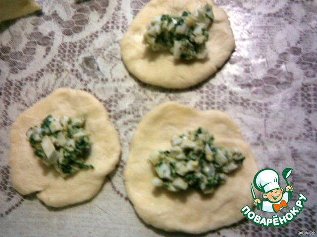 А дальше все просто: кусочки превращаю в лепешки (руками, можно скалкой) выкладываю начинку, защипываю края и на противень швом вниз (противень смазать сливочным маслом).