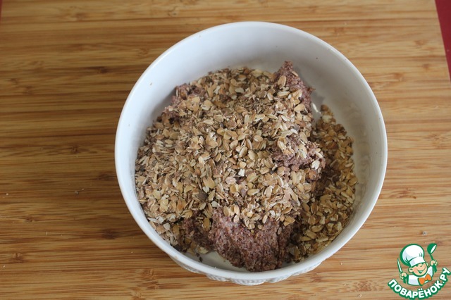 Обжарить овсяные хлопья на сухой сковороде до золотистого цвета и слегка орехового запаха.
