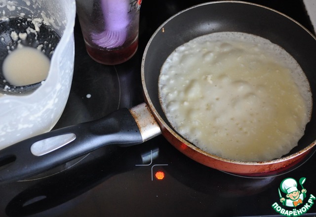 Берём небольшую сковороду, так как блинчики очень нежные. Смазываем горячую сковороду кисточкой маслом, наливаем тесто половником, равномерно распределяя по сковороде.