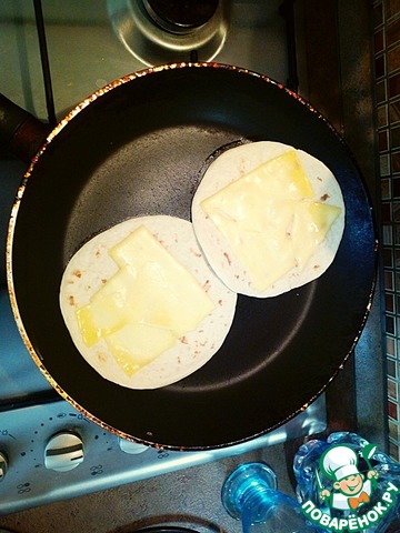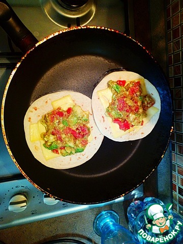 Лепёшки тортильи смазываем маслом и выкладываем на разогретую сковородку смазанной стороной вниз. Можно готовить и на гриле.