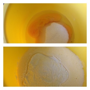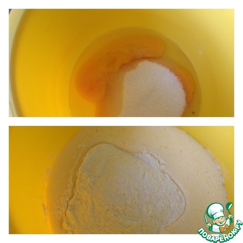 Яйца взбить с сахаром не менее 2 минут миксером, до пышной белой массы. Затем влить молоко и всыпать муку, взбить совсем недолго.