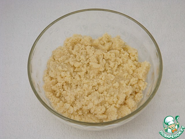 Налить масло в манную смесь и растереть ее пальцами в крошку. Накрыть пищевой пленкой и оставить при комнатной температуре на ночь.