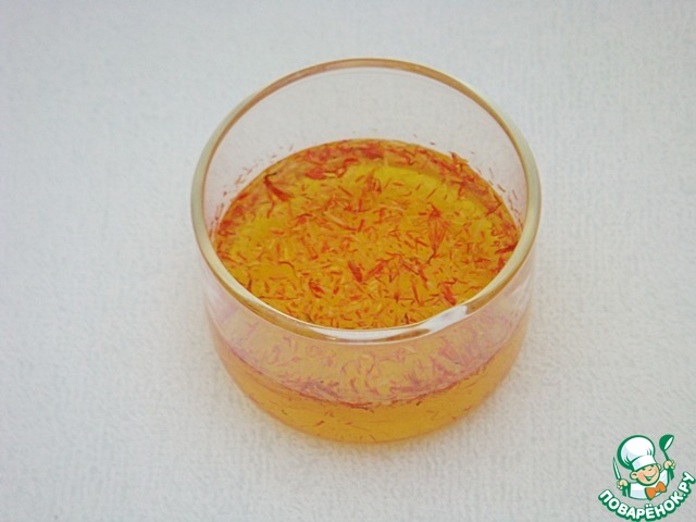 Через пять минут процедить подкрашенную шафраном воду.