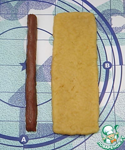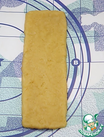 Тесто разделить на две равные части. Каждую раскатать в виде полоски шириной 7 см и толщиной полсантиметра.