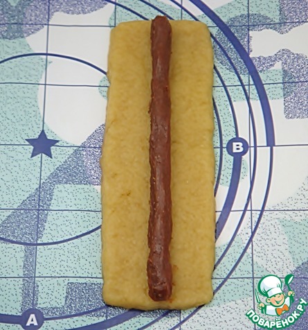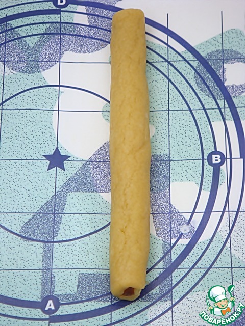 Завернуть ее в тесто со всех сторон. Слегка раскатать получившийся цилиндр.
