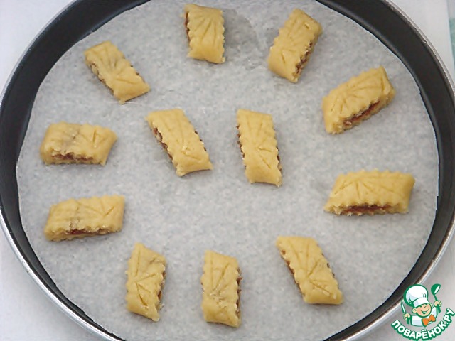 Выложить заготовки в форму, застеленную бумагой для выпечки и выпекать в разогретой до 180 º духовке в течение 30 минут. Печенье должно зарумяниться.