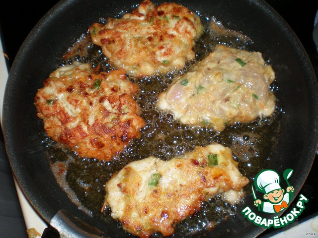 В хорошо разогретую сковородку с растительным маслом выкладывать по 1 ст. ложки фарша и обжаривать до готовности с обеих сторон.