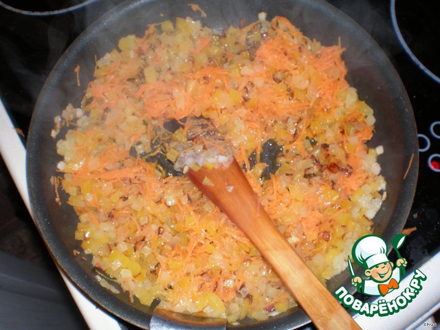 Обжарить в растительном масле мелко нарезанный лук, перчик и морковочку.