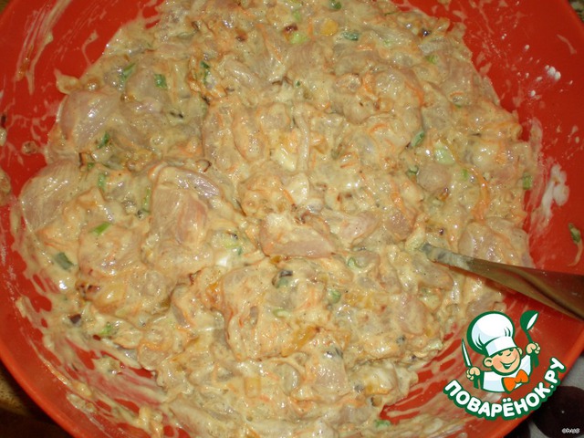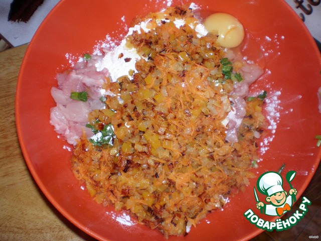 В отдельную посуду мелко нарезать филе птички, добавить соль, перец, майонез, яйца, манку и крахмал. Затем добавить обжаренные овощи.