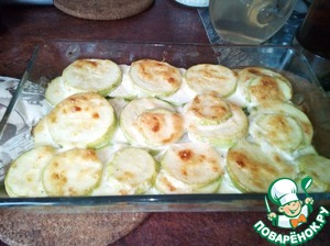 Выкладываем кабачки в форму, каждый слой смазываем нашей заправкой