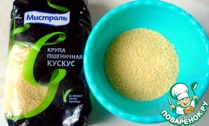 Кускус ТМ Мистраль, насыпать в мисочку, добавить соль и с 0,5 ч. л. оливкового масла, перемешать. Залить кипятком в соотношении 1:2 по объему, накрыть крышкой и дать постоять 5 минут. За это время кускус впитает в себя воду, набухнет и будет готов. По истечении указанного времени перемешайте его вилкой, как бы взбивая, чтобы он не слипался.