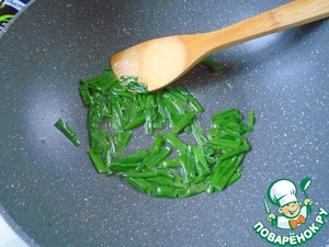 Зеленый лук нарезать перьями и быстро обжарить в воке, с добавлением оливкового масла в течении 30 секунд.