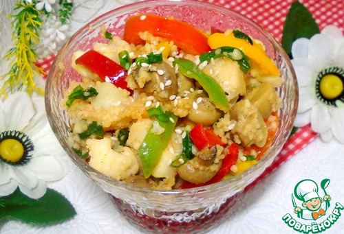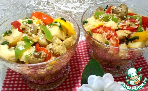 Теплая, овощная, сытная закуска с кускусом. Кускус – очень удобная крупа для быстрых и вкусных повседневных блюд: он быстро готовится, не требует особых навыков и отлично комбинируется с другими продуктами, вбирая их вкусы и ароматы. Кускус с овощами можно подавать и как самостоятельное лёгкое блюдо.