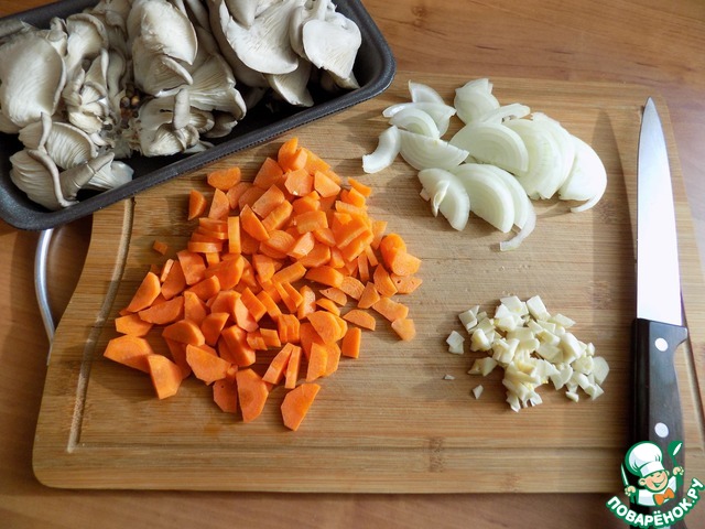 Готовим овощи. Лук режем полу-кольцами, морковь произвольно, чеснок мелко.