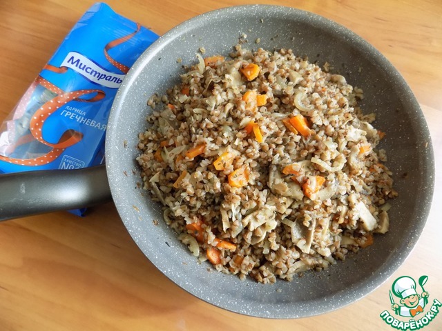Перемешиваем, наливаем бульон и сверху выкладываем гречку сваренную. Под крышкой томим до полного впитывания бульона.