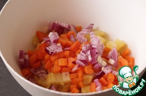 Выложить в миску картофель и морковь, нарезанные на кубики, добавить мелко нарезанный лук.