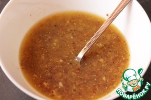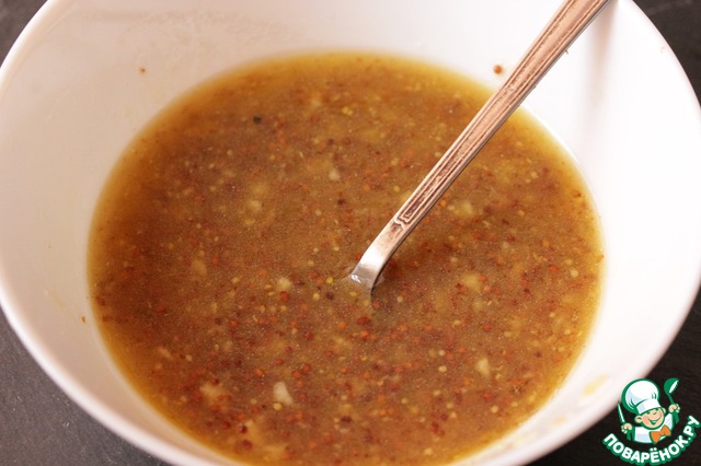 Приготовить заправку: смешать масло, горчицу, мед, уксус и измельченный чеснок.