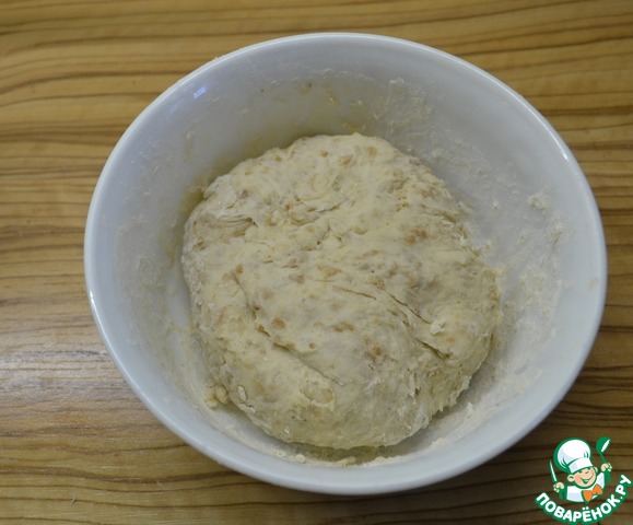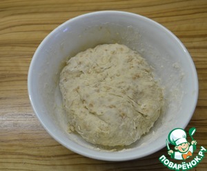 Влить воду с дрожжами. Замесить тесто. Поставить его подходить в тепло на 40 минут.