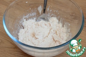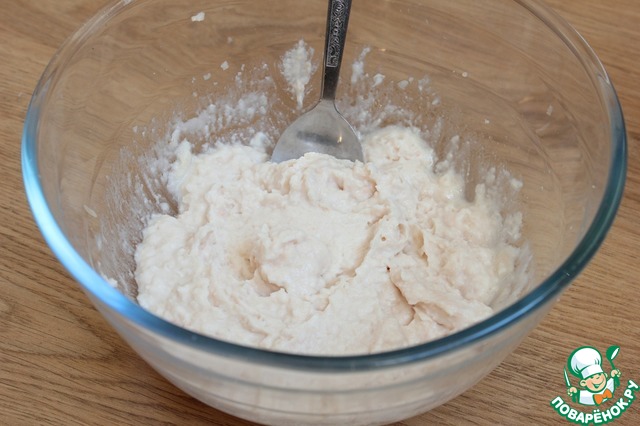 Добавляю в пюре растительное масло, соль, муку. Замешивают однородное тесто. Оно должно быть достаточно густым (не падать с ложки). -