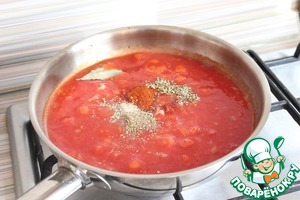 Затем добавляю томаты в собственном соку, орегано, кориандр, белый молотый перец, лавровый лист, паприку.