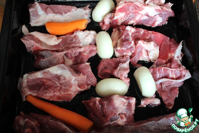 Косточки заливаем горячей водой, добавляем соль, корень петрушки, перчик горошком и варим на слабом огне 3-4 часа после закипания под крышкой. Обязательно снимаю пену. На противень вылить 2 половника горячей воды, поорудовать лопаткой и все слить в кастрюлю с бульоном. Через 1-1,5 час после закипания добавляю сырое мясо, так оно получается не сильно разваренным и более вкусным.. Пропорции костей и мяса с водой. Мясо должно быть едва покрыто водой. У меня на 1,5 кг мяса+ 1,5 кг костей ушло где-то 2,8 литра воды. За 1 час до окончания варки добавляем лук и морковь с противня. Из готового бульона вынуть мясо и кости, процедить. Иногда для более насыщенного вкуса я бульон увариваю в 2 раза. Для вторых блюд и соусов такой бульон подходит идеально. Если собираетесь бульон уваривать, то солить нужно в 2-3 раза меньше. Выкипает вода, а все вкусное остается в бульоне. Мои очень любят попить такой свежесваренный бульон из кружечки. Это очень вкусно и ароматно. На фото момент закладки мяса.