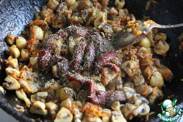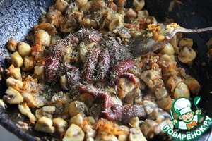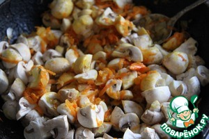 Обжарить лук и морковь. Добавить к ним грибы (маленькие), нарезанные на четвертинки (или как вы любите). Потушить.
