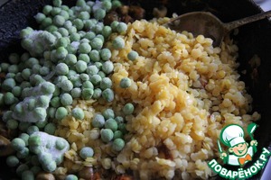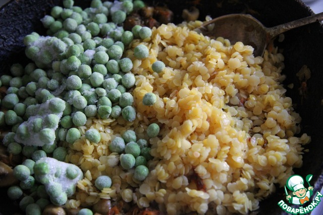 Далее добавить чечевицу, горошек и бульон, продолжать тушить до готовности горошка и до выпаривания лишней жидкости. В конце посолить.