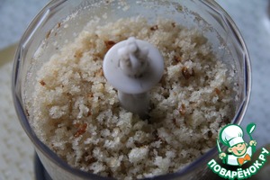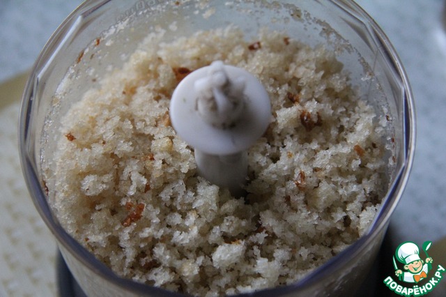 Подготовить крошку: черствый хлеб перемолоть в блендере с чесноком (по вкусу) и растительным маслом.