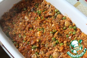 Форму для запеканки слегка смазать маслом, присыпать панировочными сухарями и выложить тушеные овощи с чечевицей.