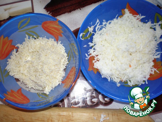 Отварить яйца, очистить. Отделить белки от желтков. Белок натереть на мелкой терке. Натереть отдельно желток.